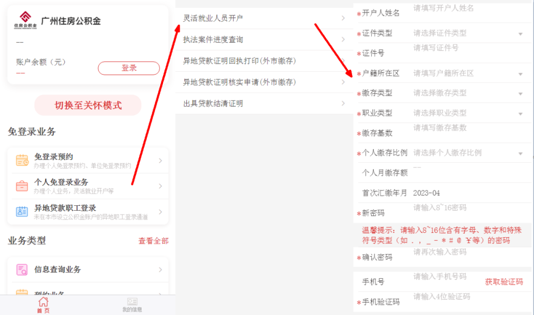 点击“查询办理”“个人免登录业务”“灵活就业人员开户”→填写开户信息。
